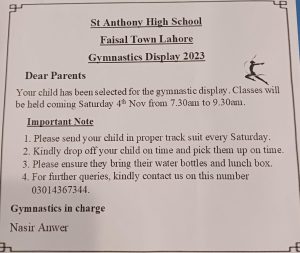 Gymnastics Display Posted by nimda Categories Sports Date November 3, 2023 We were pleased to announce the Gymnastics Display at St. Anthony’s High School. Classes: 1 to 5 Student lists will be shared in class groups. Share: nimda Previous post Sports House November 3, 2023 Next post Matches November 3, 2023 You may also like SAFT MUN 2024 March 18, 2024 Matches November 3, 2023 Sports House October 31, 2023